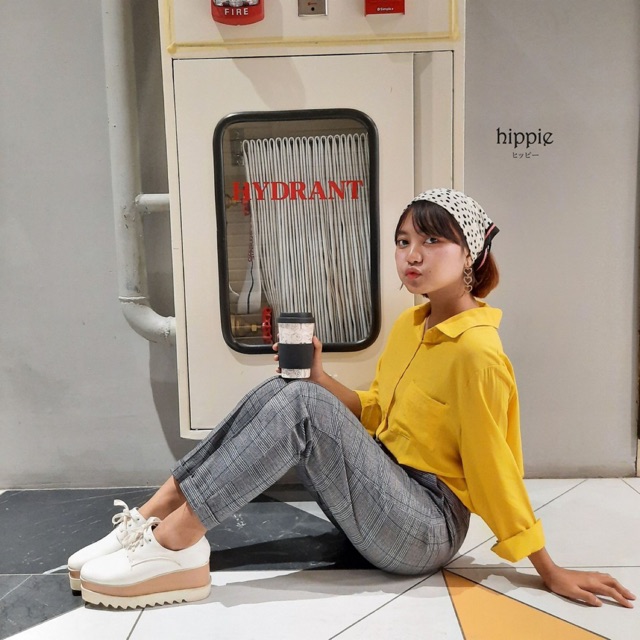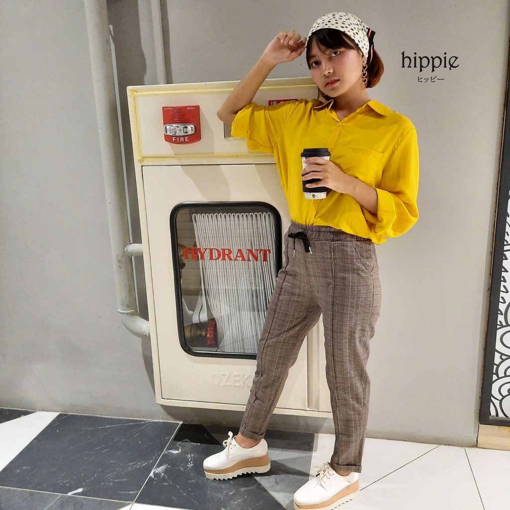 Celana bahan dengan motif kotak-kotak cocok sekali di padukan dengan kemeja atau kaos polos
